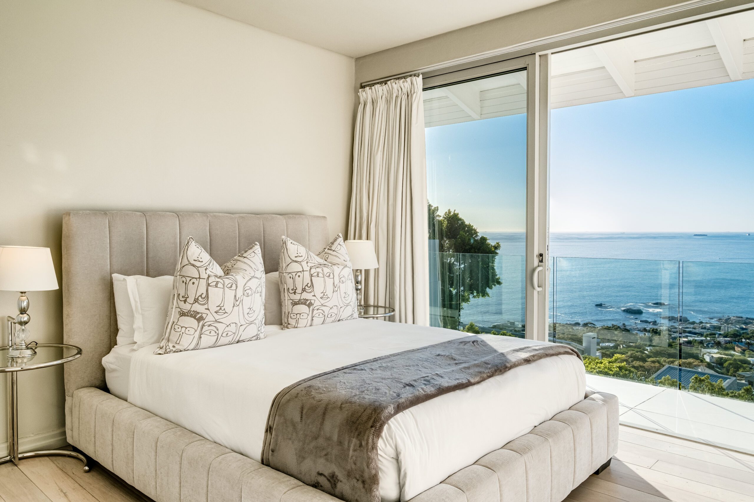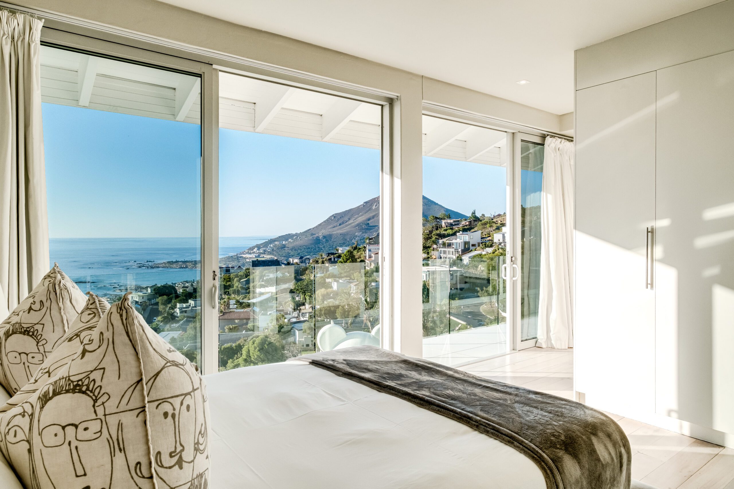 The guest room offers a serene retreat with stunning views of the ocean and Lion’s Head. A balcony allows guests to fully appreciate the breathtaking scenery. The room is thoughtfully furnished with a comfortable workspace, perfect for those needing to catch up on work. The guest room shares a separate bathroom with Guest Room 2.